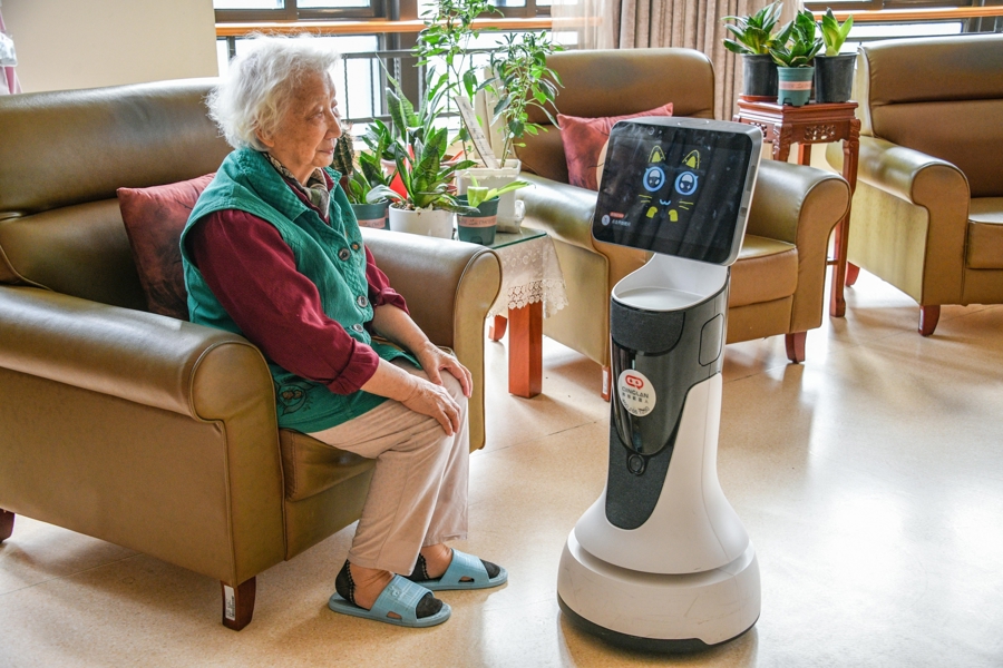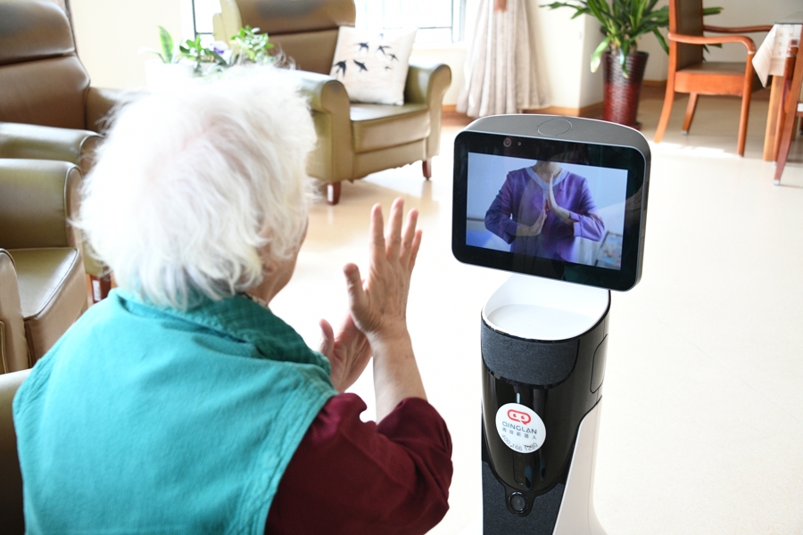 图为闵行区君莲养老院内的机器人正与老人互动。/文汇报记者邢千里摄