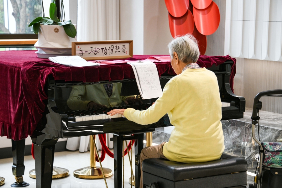 图为老人正在养老院内弹钢琴。 /文汇报记者邢千里摄
